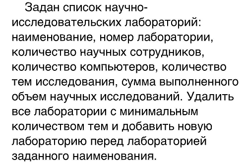 Pascal. Ввод массива, сортировка по первому полю, вывод. Задан список научно-исследовательских лабораторий. Удалить все лаборатории с минимальным количеством тем и добавить новую лабораторию перед лабораторией заданного наименования.