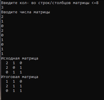 Дана целочисленная квадратная матрица A(8,8). Проверить, все ли элементы побочной диагонали матрицы нули? Если нет, матрицу не преобразовывать и вывести сообщение. Если да, то заменить элементы главной диагонали матрицы на единицы. Исходную и преобразованную матрицы вывести. Для решения задачи составить подпрограммы: