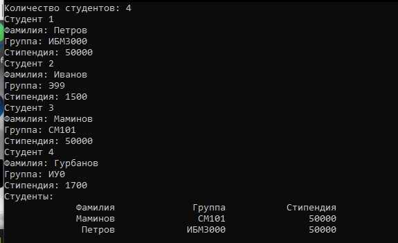 Создать массив записей A(n), где n “меньше или равно” 20, содержащий сведения о студентах: фамилия, группа, стипендия. Используя функцию, сформировать массив, в котором содержится сведения о студентах, получающих повышенную стипендию, и упорядочить этот массив по алфавиту. В главной функции полученный массив вывести на экран.
