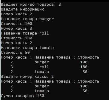 a) создается файл произвольного доступа каждая запись которого имеет следующую структуру: номер кассы, название товара, стоимость; b) выводится содержимое созданного файла в консоль; c) формируется новый файл товаров, проданных через кассу с заданным номером, номер кассы запрашивается у пользователя. d) сформированный файл выводится в консоль. e) определяется общая сумма товаров, проданных через кассу с заданным номером.