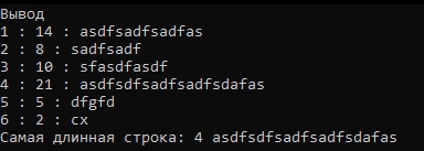 Дан текстовый файл, содержащий несколько строк произвольного текста. Составить программу, которая находит в данном файле самую длинную строку и определяет её номер. Вывести в консоль содержимой исходного файла найденную строку и её номер.