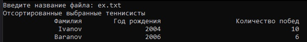 Pascal. Считать массив записей из текстового файла. Запись содержит следующие поля: фамилия, год рождения, количество побед. С помощью процедуры выбрать теннисистов, моложе 23 лет и одержавших более 5 побед. Упорядочить все записи в порядке убывания