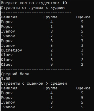 Создать запись студентов фамилия группа оценка. Вывести на экран В порядке от лучших к худшим Вывести отдельно средний балл И кто выше среднего балла вывести отдельно