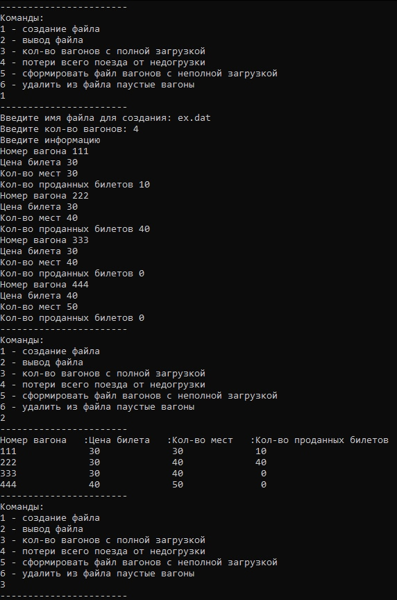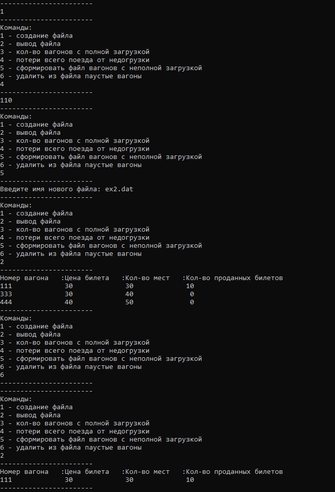 - Процедуру, удаляющую из файла пустые вагоны.