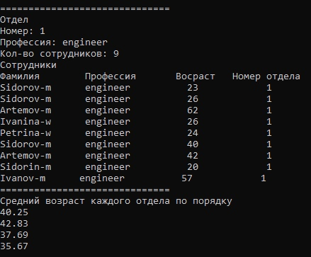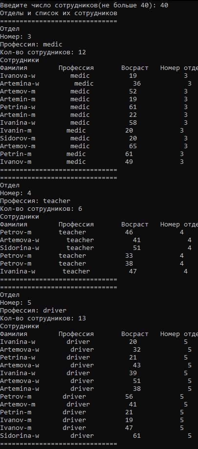 - с сотрудниками: фамилия, профессия, возраст, номер отдела