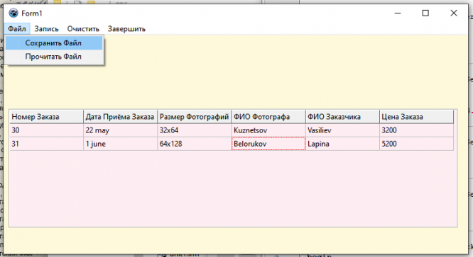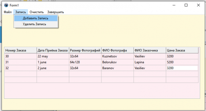 Для студентов МГТУ им. Н.Э.Баумана по предмету ИнформатикаЗаписи: фотография. Журнал записей содержит информацию: номер заказа, дата приёма заказа, размер фотографии, ФИО фотографа, ФИО заказчика, цена заказаЗаписи: фотография. Журнал записей содержит информацию: номер заказа, дата приёма заказа, размер фотографии, ФИО фотографа, ФИО заказчика, цена заказа