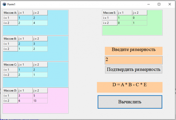 Главная » Учебные материалы » Информатика » Решения задач » МГТУ им. Н.Э.Баумана » 2 семестр » Lazarus. Даны квадратные матрицы А, В, С размерности п. Вычислить матрицу D. Е — единичная матрица. Для решения задачи применить процедуры: сложения, вычитания и умножения матриц. Исходные и получаемые матрицы должны отображаться на форме.