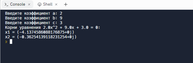 Программа на Python - \" Решает квадратное уравнение вида ax^2 + bx + c = 0 \" программа на Python, которая решает квадратное уравнение вида ax^2 + bx + c = 0: В этой программе сначала пользователь вводит значения коэффициентов a, b и c. Затем программа вычисляет дискриминант d = b^2 - 4ac и находит корни уравнения с помощью функции cmath.sqrt(), которая возвращает комплексный корень из числа. Результаты выводятся на экран. Если дискриминант отрицательный, то корни будут комплексными. Python program - \"Solves a quadratic equation of the form ax^2 + bx + c = 0\" Python program that solves a quadratic equation of the form ax^2 + bx + c = 0: In this program, the user first enters the values of the coefficients a, b, and c.