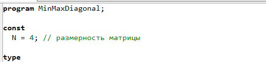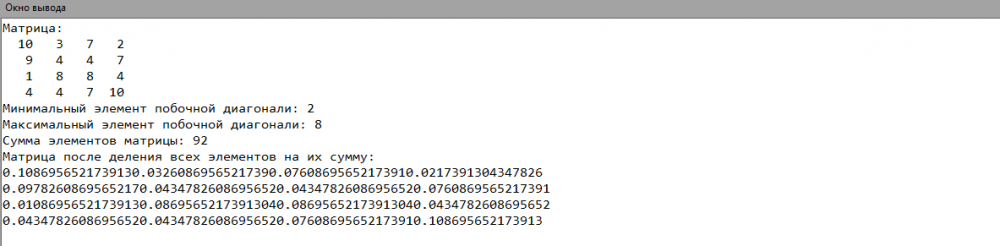 Главная » Учебные материалы » Информатика » Решения задач » МГТУ им. Н.Э.Баумана » Несколько классов/семестров » В матрице найти минимальный и максимальный элементы побочной диагонали, поделить все элементы на их сумму (используя процедуру/функцию)