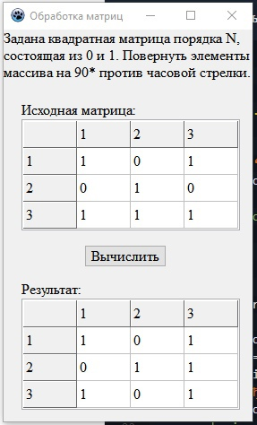 Для студентов МГТУ им. Н.Э.Баумана по предмету ИнформатикаЗадана квадратная матрица порядка N, состоящая из 0 и 1. Повернуть элементы массива на 90 градусов против часовой стрелкиЗадана квадратная матрица порядка N, состоящая из 0 и 1. Повернуть элементы массива на 90 градусов против часовой стрелки