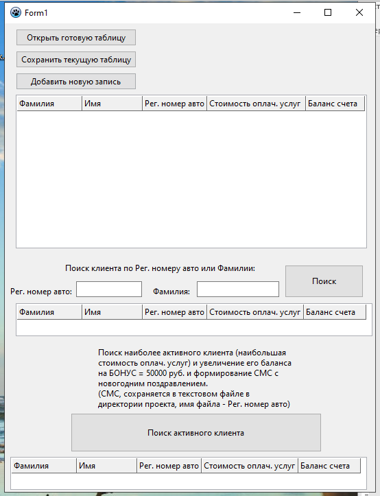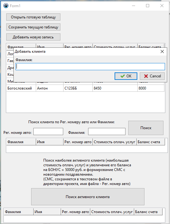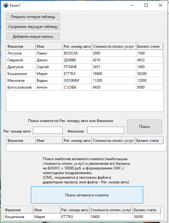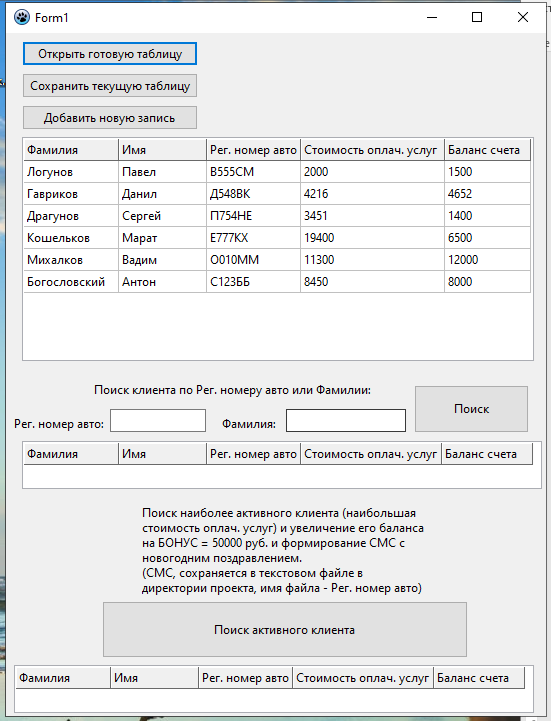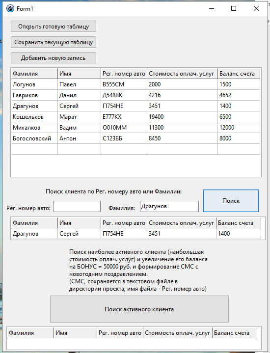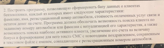 Построить программу, позволяющую сформировать базу данных о клиентах бензоколонки, каждый из которых имеет следующие характеристики: фамилию, имя, регистрационный номер автомобиля, стоимость оплаченных услуг связи и остаток денег на счете. Программа должна обеспечить возможность поиска клиента по заданному номеру автомобиля или фамилии с визуализацией его характеристик, а также возможность поиска наиболее активного клиента, увеличение его счета на величину бонуса и формирование для него текста СМС с новогодним поздравлением, сохраненным в текстовом файле с именем, совпадающим с регистрационным номером автомобиля.