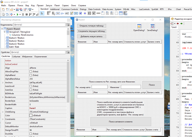 Условия для программы, под которые она выполнена: Построить программу, позволяющую сформировать базу данных о клиентах бензоколонки, каждый из которых имеет следующие характеристики: фамилию, имя, регистрационный номер автомобиля, стоимость оплаченных услуг связи и остаток денег на счете. Программа должна обеспечить возможность поиска клиента по заданному номеру автомобиля или фамилии с визуализацией его характеристик, а также возможность поиска наиболее активного клиента, увеличение его счета на величину бонуса и формирование для него текста СМС с новогодним поздравлением, сохраненным в текстовом файле с именем, совпадающим с регистрационным номером автомобиля. Программа выполняет следующие действия: При нажатии на кнопку \"Открыть готовую таблицу\" (Button1Click), пользователь может выбрать файл таблицы с клиентами, представленный в формате CSV, и загрузить его в таблицу StringGrid1.