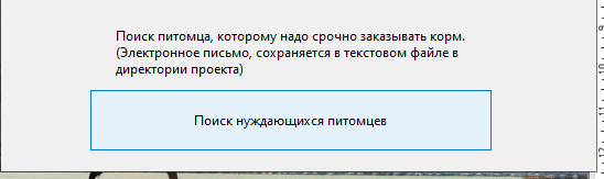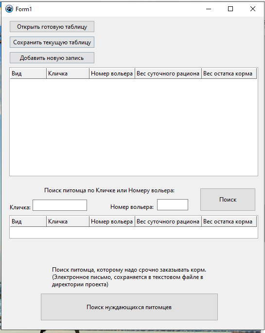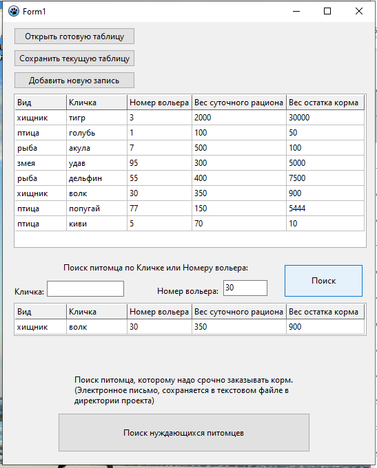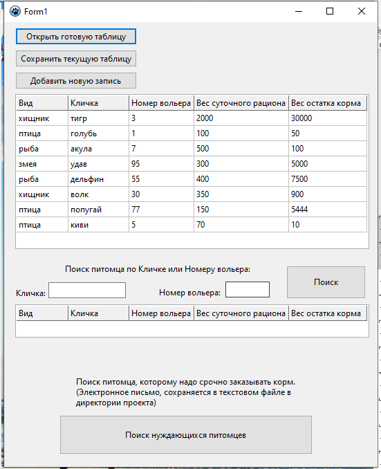 Поиск животного по номеру вольера или кличке и отображение результатов в StringGrid2 при нажатии на Button4. Поиск осуществляется по значению, введенному в Edit2 (по номеру вольера) или Edit1 (по кличке). Поиск животных, у которых остаток корма меньше рациона, и создание для каждого из них текстового файла с предупреждающим сообщением при нажатии на Button5. Файлы называются в соответствии с номером вольера и видом животного..