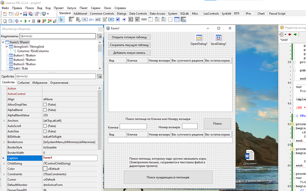 StringGrid2: ещё одна сетка, используемая для отображения результатов поиска. OpenDialog1 и SaveDialog1: диалоговые окна для открытия и сохранения файлов. Button1, Button2, Button3, Button4, Button5: кнопки, которые выполняют определенные действия при нажатии. Edit1 и Edit2: текстовые поля для ввода значений. В программе реализованы следующие функциональности:   Открытие готовой таблицы с животными из файла в формате CSV при нажатии на Button1. Сохранение текущей таблицы животных в файл в формате CSV при нажатии на Button2. Добавление нового питомца в таблицу при нажатии на Button3. Для этого открываются диалоговые окна для ввода различных данных о питомце, таких как вид, кличка, номер вольера, вес суточного рациона и вес остатка корма.