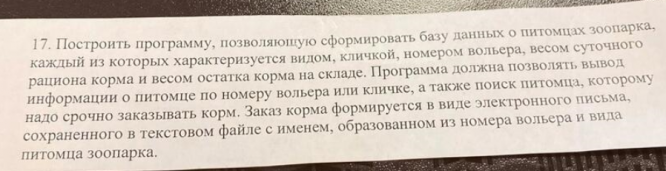 Для студентов МГТУ им. Н.Э.Баумана по предмету ИнформатикаПостроить программу, позволяющую сформировать базу данных о питомцах зоопарка, каждый из которых характеризуется видом, кличкой, номером вольера, весоПостроить программу, позволяющую сформировать базу данных о питомцах зоопарка, каждый из которых характеризуется видом, кличкой, номером вольера, весо