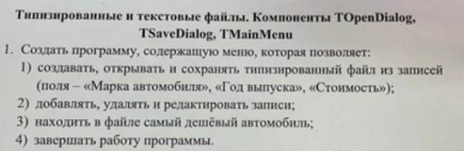 Задача: Lazarus. Меню, работа с тип. файлом, работа с записями, найти самый дешевый авто, закрытие программы.