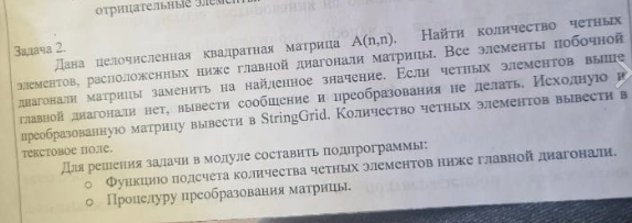 Lazarus. Целочисленная квадратная матрица, кол-во четных ниже гл. диагонали, если их нет - преобразование не делать. Исходную и преобразованную вывести в StringGrid. Кол-во четных вывести в текстовое поле.