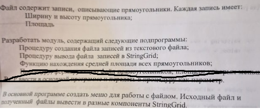 Lazarus. Файл записей - прямоугольники, ширина, высота, площадь. Процедура создание файла записей из текстового, вывода файла в StringGrid, фун-ия нахождения средней площади всех прямоугольников. Меню.