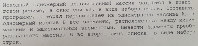 Lazarus. Задается одномерный целочисленный массив. Из A в массив B элементы между минимальным и максимальным элементами. Вывести эл-ты преобразованного массива во второе окно списка.