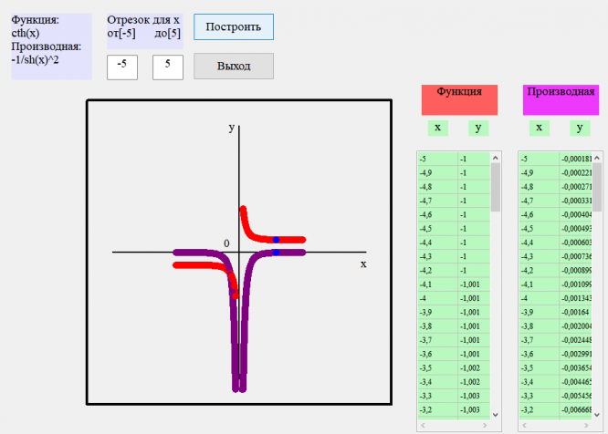 Главная » Учебные материалы » Информатика » Решения задач » МГТУ им. Н.Э.Баумана » 2 семестр » Lazarus. Построить график заданной функции и её производной, осуществить одновременное движение точек по построенным графикам. cth(x)' = -1 / sh(x)^2