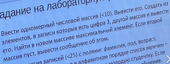Для студентов МГТУ им. Н.Э.Баумана по предмету ИнформатикаLazarus. Ввод, вывод массива. Создать из эл-ов, в записи которых есть цифра 3 другой массив, найти в нем максимальный элемент. Если новый массив пуст Lazarus. Ввод, вывод массива. Создать из эл-ов, в записи которых есть цифра 3 другой массив, найти в нем максимальный элемент. Если новый массив пуст