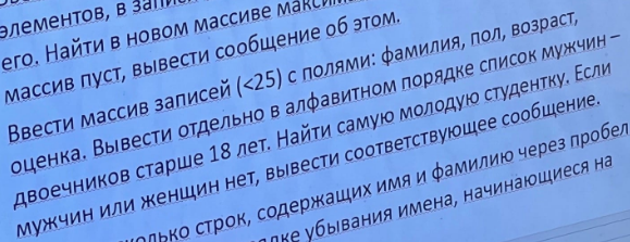 Для студентов МГТУ им. Н.Э.Баумана по предмету ИнформатикаLazarus. Массив записей: фамилия, пол, возраст, оценка. Вывести отдельно в алфавитном порядке список мужчин - двоечников старше 18 лет. Найти самую мLazarus. Массив записей: фамилия, пол, возраст, оценка. Вывести отдельно в алфавитном порядке список мужчин - двоечников старше 18 лет. Найти самую м