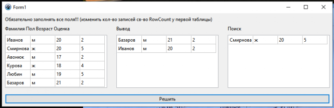 Lazarus. Массив записей: фамилия, пол, возраст, оценка. Вывести отдельно в алфавитном порядке список мужчин - двоечников старше 18 лет. Найти самую молодую студентку.