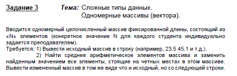 Вводится одномерный целочисленный массив фиксированной длины, состоящий из «N» элементов (конкретное значение N для каждого студента индивидуально задается преподавателем). Требуется: 1) Вывести исходный массив в строку (например, 23.5 45.1 и т.д.).