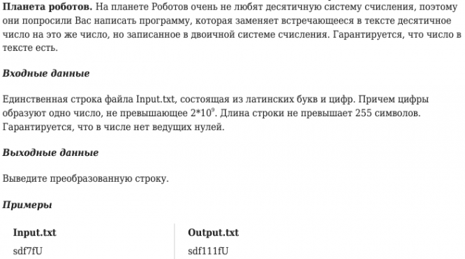 Главная » Учебные материалы » Информатика » Решения задач » НИУ «МЭИ» » Несколько классов/семестров » Планета роботов - На планете Роботов очень не любят десятичную систему счисления, поэтому они попросили Вас написать программу, которая заменяет встречающееся в тексте десятичное число на это же число, но записанное в двоичной системе счисления. Гара