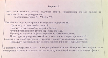 Задача: Lazarus. Файл записей, разработать модуль с 2 любыми процедурами помимо создания и вывода. Отрезки прямой на плоскости.