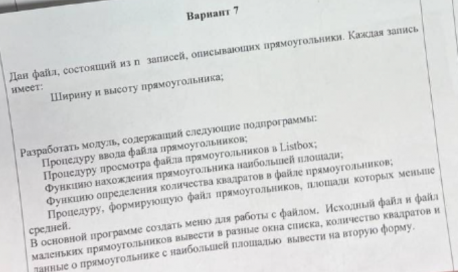Lazarus. Файл записей, разработать модуль с 2 любыми процедурами помимо создания и вывода. Ширина и высота прямоугольника.