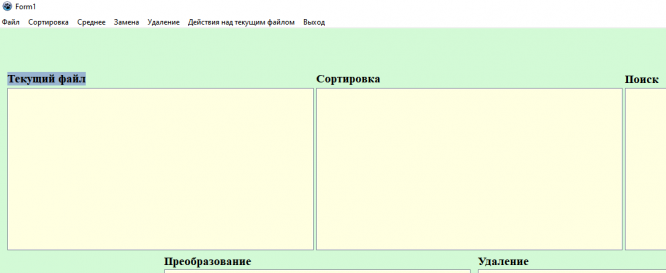 А уже по заданию можно использовать остальные кнопки меню, которые каждый раз будут просить файл для работы, можно выбирать один и тот же ( Сортировка, Среднее, Замена, Удаление).