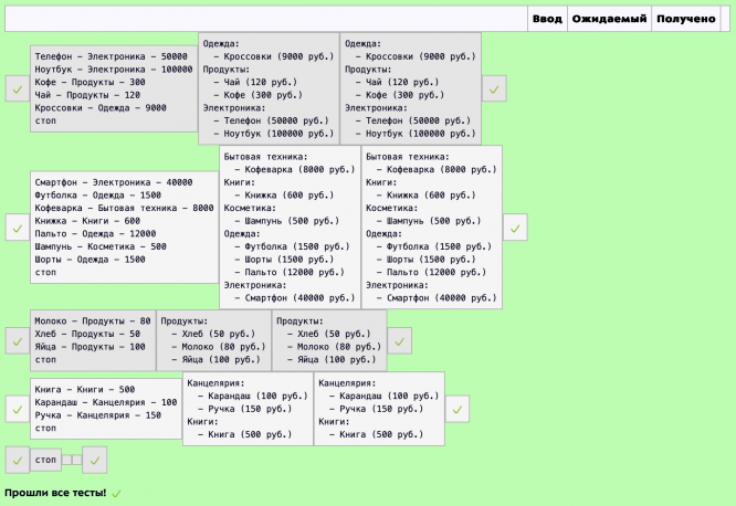 - В случае, если у товаров внутри одной категории одинаковая цена, их нужно сортировать по алфавиту.