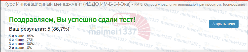 Для студентов ИДДО НИУ «МЭИ» по предмету Инновационный менеджментКМ-5. Основы управления инновационным проектом. Тестирование - 86%КМ-5. Основы управления инновационным проектом. Тестирование - 86%