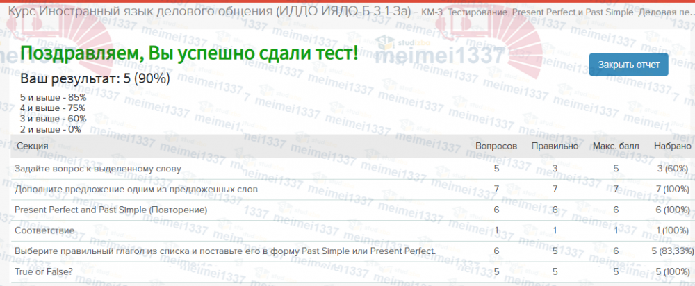 Для студентов ИДДО НИУ «МЭИ» по предмету Иностранный язык делового общенияКМ-3. Тестирование. Present Perfect и Past Simple. Деловая переписка - 90%КМ-3. Тестирование. Present Perfect и Past Simple. Деловая переписка - 90%