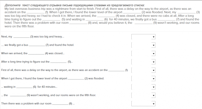 My last overseas business trip was a nightmare from start to finish. First of all, there was a delay on the way to the airport, as there was an accident on the ___ (1). When I got there, I found the lower level of the airport ___ (2) was flooded. Next, my ___ (3) was too big and heavy, so I had to check it in. When we arrived, the ___ (4) was closed, and there were no cabs at all. After a long time trying to figure out the ___ (5) and waiting in ___ (6) for 40 minutes, we finally got a bus ___ (7) and found the hotel. Then there was a problem with our room ___ (8) and, would you believe it, the ___ (9) wasn't working, and our rooms were on the fifth floor.