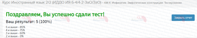 Курс Иностранный язык - КМ-4. Инфинитив. Эмфатические конструкции. Тестирование - 100%