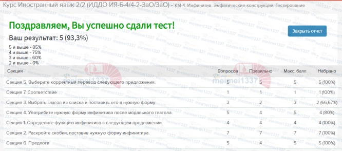 Курс Иностранный язык - КМ-4. Инфинитив. Эмфатические конструкции. Тестирование - 93.3%
