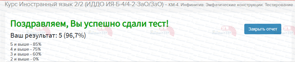 Курс Иностранный язык - КМ-4. Инфинитив. Эмфатические конструкции. Тестирование - 96,7%