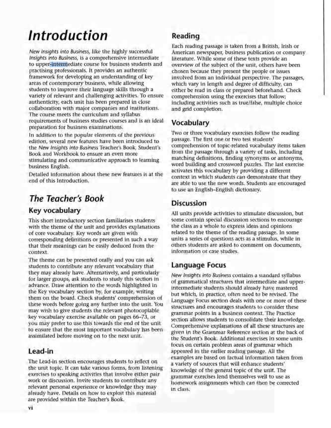 In addition to the popular elements of the previous edition, several new features have been introduced to the New Insights into Business Teacher's Book, Student's Book and Workbook to ensure an even more stimulating and communicative approach to learning business English. Text of the description was copied from the uploaded file.