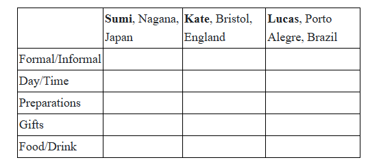 Прослушайте трех человек, рассказывающих о том, как встречают гостей в их странах. Прослушайте и заполните таблицу согласно указанным пунктам.
