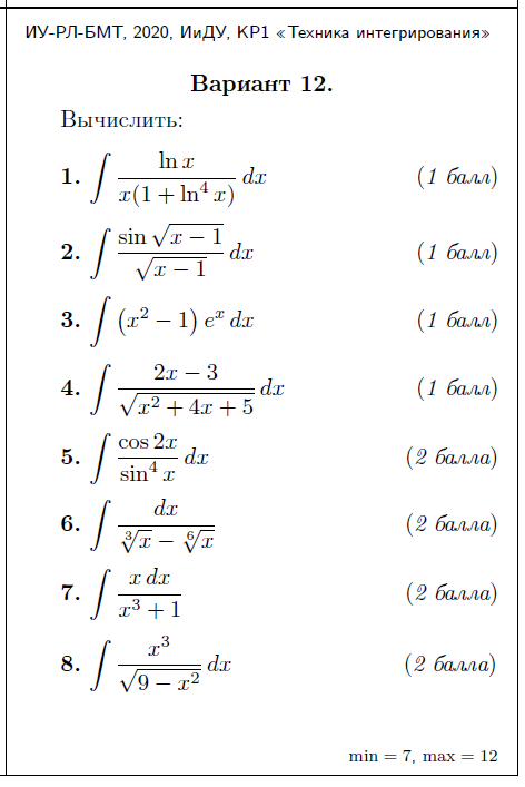 Ответы к контрольной работе 1: Техника интегрирования вариант 12
