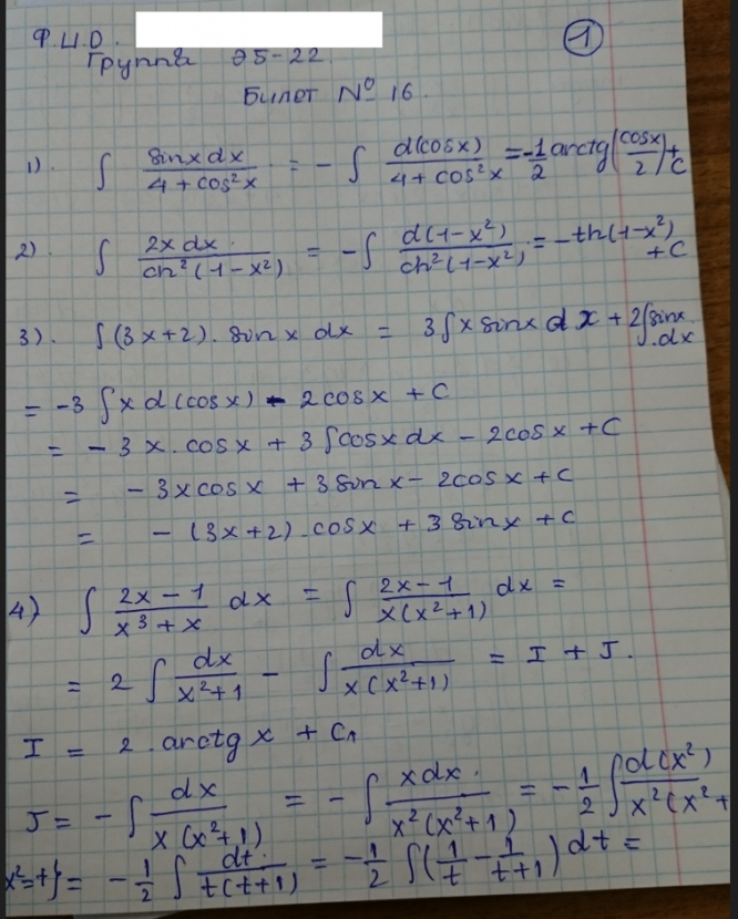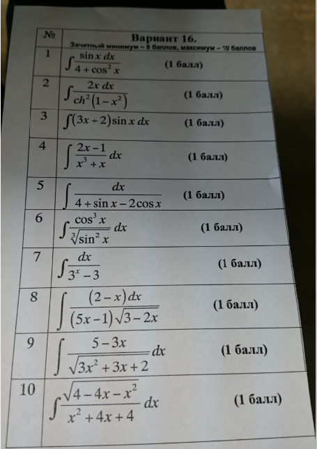 Ответы к контрольной работе 1: Решение билета (10 ЗАДАЧ) - Неопределенные интегралы вариант 16