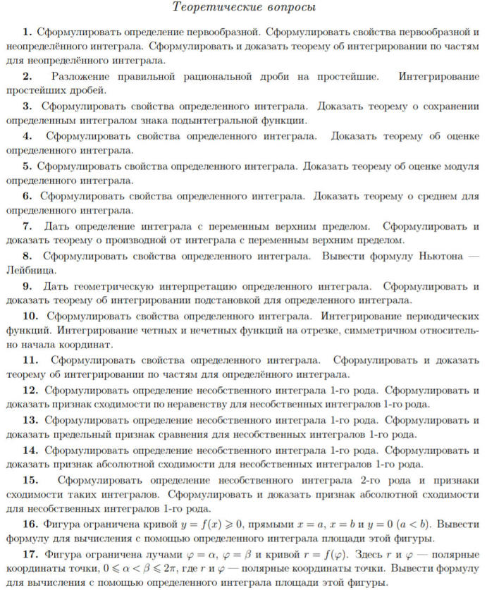 1. Сформулировать определение первообразной. Сформулировать свойства первообразной и неопределённого интеграла. Сформулировать и доказать теорему об интегрировании по частям для неопределённого интеграла. Разложение правильной рациональной дроби на простейшие. простейших дробей. 3. Сформулировать свойства определенного интеграла. Доказать теорему о сохранении определенным интегралом знака подынтегральной функции. 4. Сформулировать свойства определенного интеграла. Доказать теорему об оценке определенного интеграла. 5. Сформулировать свойства определенного интеграла. Доказать теорему об оценке модуля определенного интеграла. 6. Сформулировать свойства определенного интеграла.