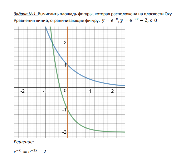 Задача №1. Вычислить площадь фигуры, которая расположена на плоскости Оху. Уравнения линий, ограничивающие фигуру: y = ⅇ −x , y = ⅇ −2x − 2, x=0Задача №2. Фигура, расположенная на плоскости Оху, вращается около координатной оси. Вычислить объёмы полученного тела вращения. Уравнения линий, ограничивающие фигуру