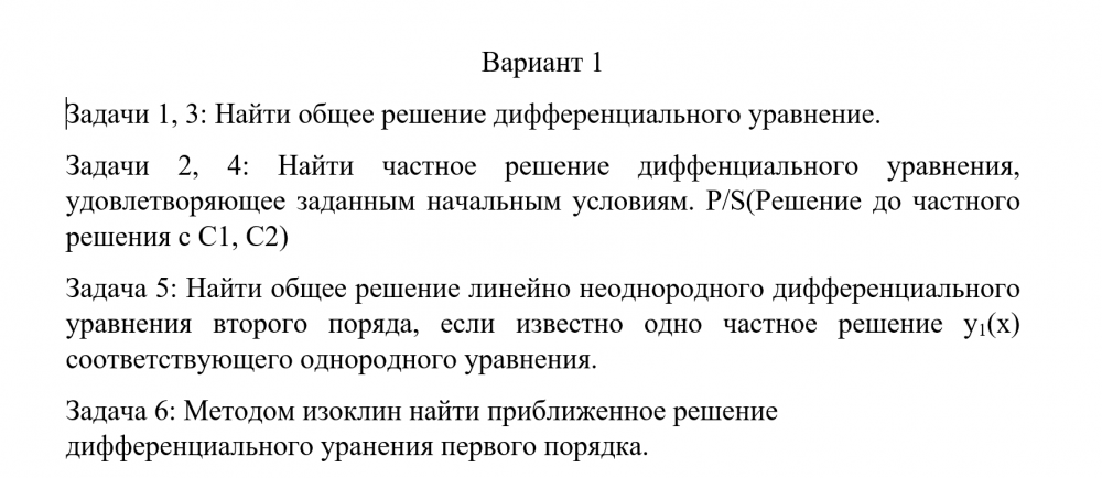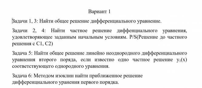 Вариант 1 Задачи 1, 3: Найти общее решение дифференциального уравнение. Задачи 2, 4: Найти частное решение диффенциального уравнения, удовлетворяющее заданным начальным условиям. P/S ( Решение до частного решения с C1, C2 ) Задача 5: Найти общее решение линейно неоднородного дифференциального уравнения второго поряда, если известно одно частное решение y1( x ) соответствующего однородного уравнения. Задача 6: Методом изоклин найти приближенное решение дифференциального уранения первого порядка. .