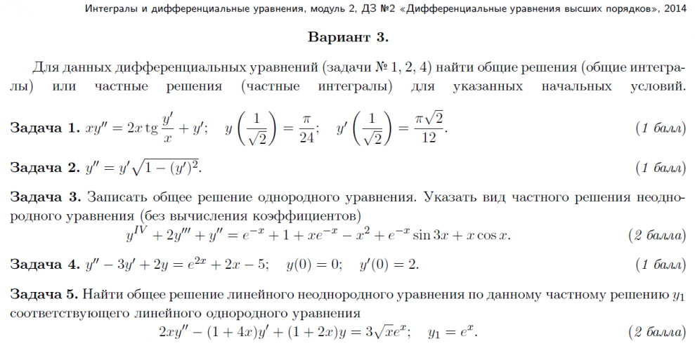 Вариант 3 - ДЗ №2 - "Дифференциальные уравнения высших порядков" - 5 задач