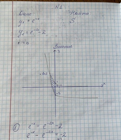 Задача №1. Вычислить площадь фигуры, которая расположена на плоскости Оху. Уравнения линий, ограничивающие фигуру: y = ⅇ −x , y = ⅇ −2x − 2, x=0