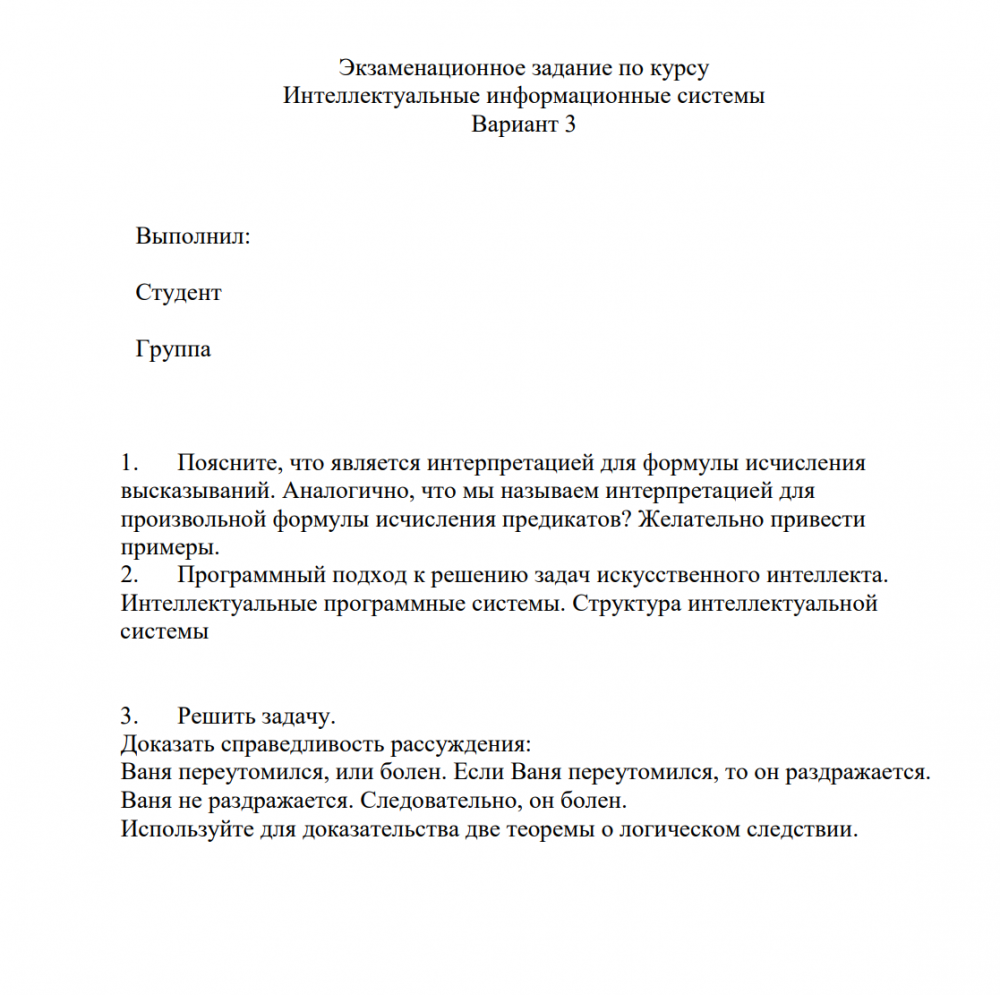 Для студентов ИДДО НИУ «МЭИ» по предмету Интеллектуальные информационные системы (ИИС)Полный курс Итоговая работа (Экзаменационное письменное задание) - Вариант 3Полный курс Итоговая работа (Экзаменационное письменное задание) - Вариант 3