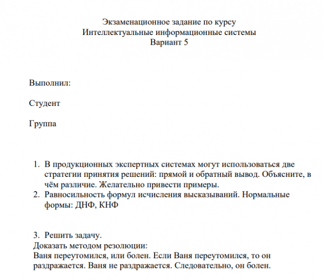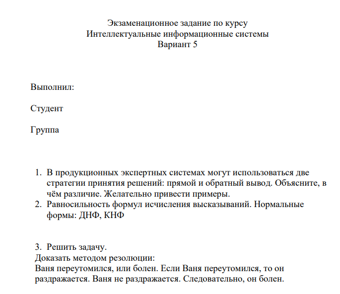 Для студентов ИДДО НИУ «МЭИ» по предмету Интеллектуальные информационные системы (ИИС)Полный курс Итоговая работа (Экзаменационное письменное задание) - Вариант 5Полный курс Итоговая работа (Экзаменационное письменное задание) - Вариант 5
